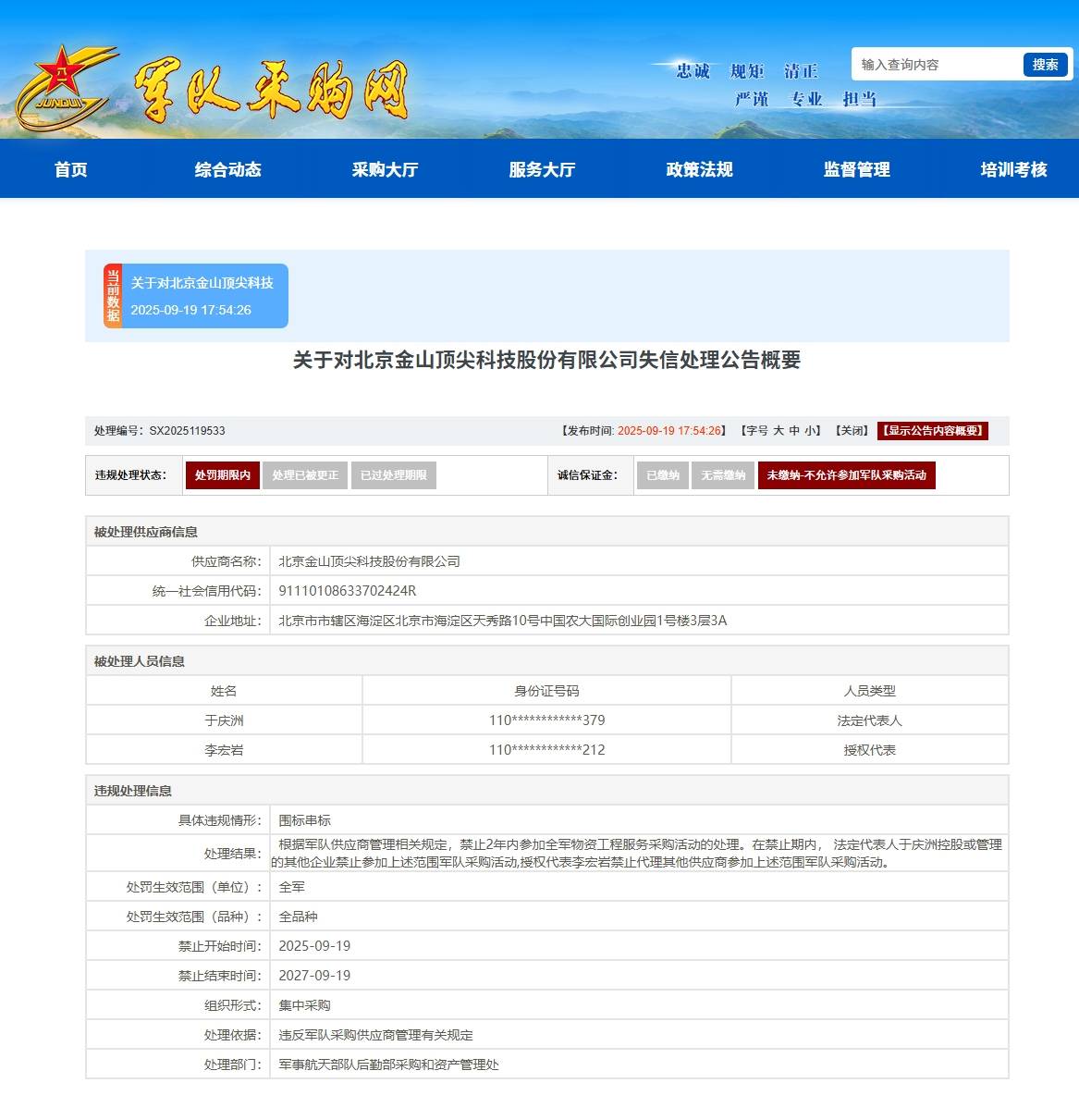 探针财经从军队采购网获悉,2025年9月19日,军事航天部队后勤部采购和资产管理处对北京金山顶尖科技股份有限公司(以下简称“金山顶尖”)作出失信处理(编号:SX2025119533)。