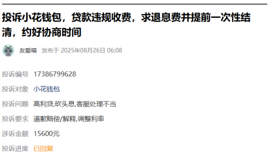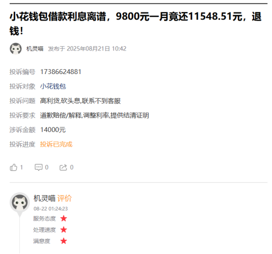 编号为17386592557的投诉显示,用户从小花钱包上借款后,在不知情的情况下,小花钱包先后12次收取用户3936元会员费。投诉处理进度显示,8月22日小花钱包完成答复,8月25日,用户对此次申请退款的投诉处理结果给出五星好评。