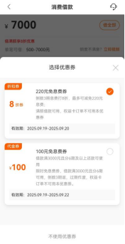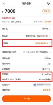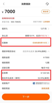 9月19日上午,记者尝试使用小花钱包借款7000元时发现,平台并未提示购买权益包,但提供了两张不同抵扣金额的优惠券,记者分别勾选后,页面显示的综合年化成本(单利)均为35.99%,但总息费却不相同。