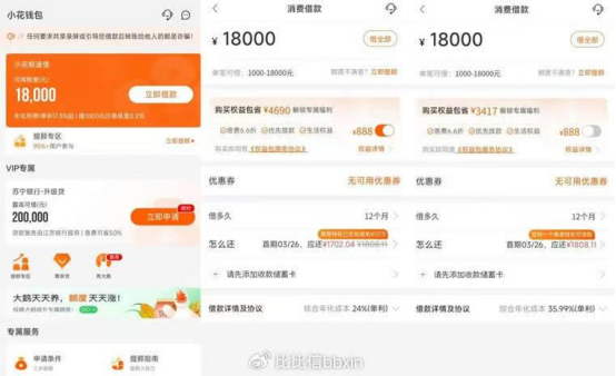 根据WEMONEY研究室发布的数据,他们在尝试通过小花钱包APP借款7000元时,页面默认开通428元/月的权益包(会员费),每月还款661.91元,加上会员费,每月需还款1089.91元。以IRR法(Internal Rate of Return,内部收益率法)计算,勾选权益后的借款年化成本(单利)高达132%。而如果取消勾选,每月则需要还款703.16元,IRR法计算后的年化成本(单利)为35.99%。