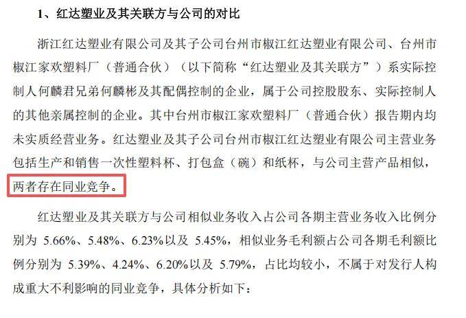 值得一提的是,实际控制人控制的惠家网络及其子公司、其女儿控制的润洁塑业及其关联方存在少量一次性航空杯、纸杯、塑料吸管销售,实际控制人之兄何某彬控制红达塑业及其关联方与公司存在相同或类似业务,上述企业与公司存在重叠供应商。