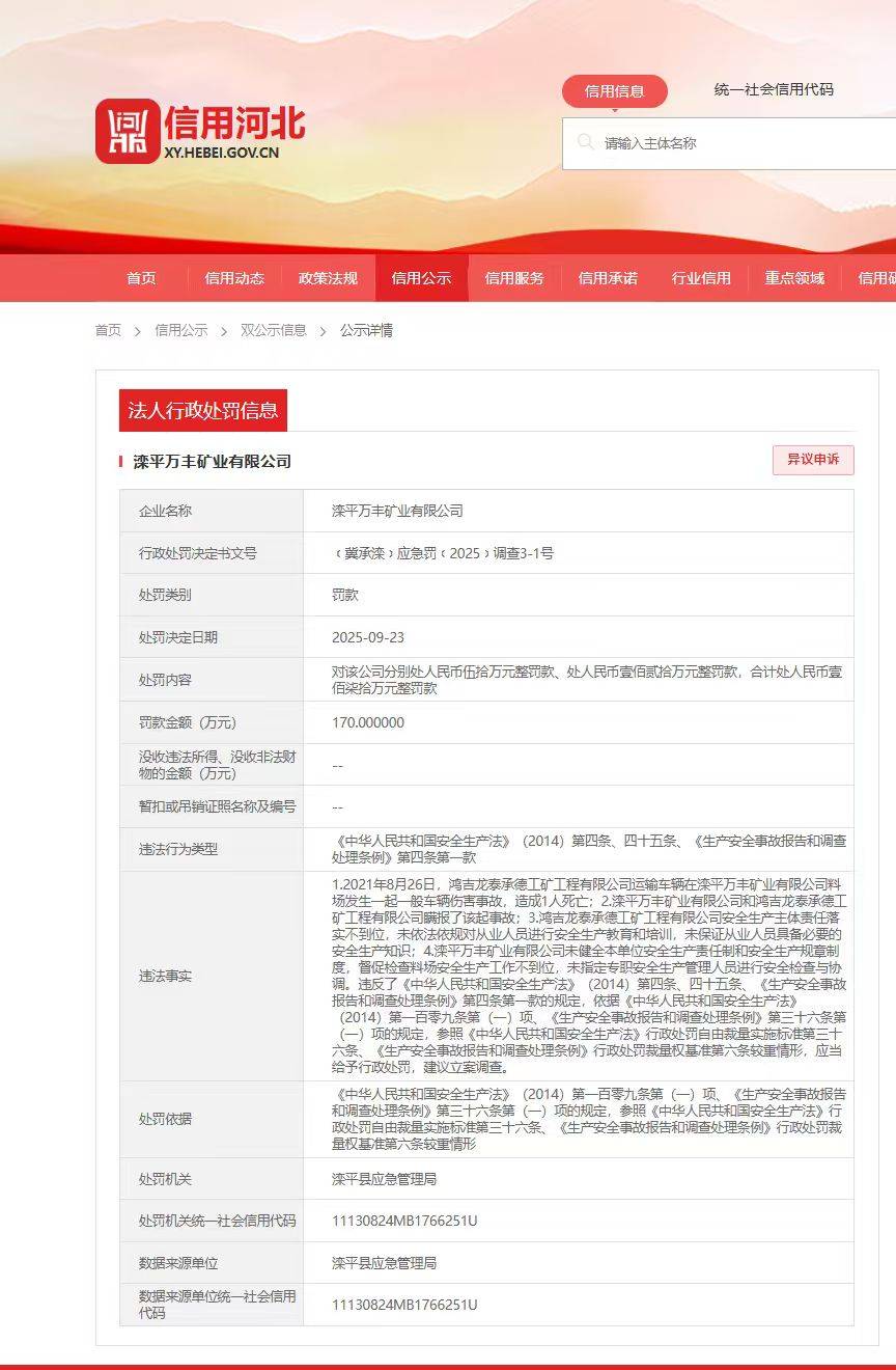 据信用河北官网2025年9月23日公开信息,滦平县应急管理局发布了两则行政处罚决定,文号分别为(冀承滦)应急罚〔2025〕调查3-1号与(冀承滦)应急罚〔2025〕调查3-2号,被处罚主体分别为滦平万丰矿业有限公司与鸿吉龙泰承德工矿工程有限公司。