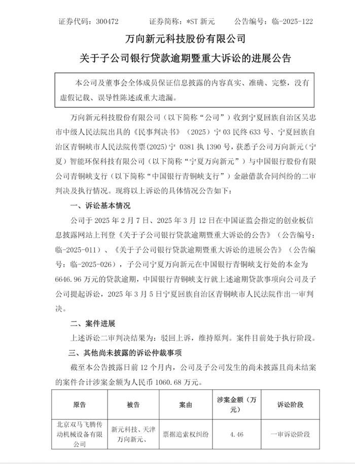 公告称,子公司万向新元(宁夏)智能环保科技有限公司与中国银行股份有限公司青铜峡支行金融借款合同纠纷二审判决结果为驳回上诉,维持原判,案件已进入执行阶段。宁夏万向新元在中国银行青铜峡支行处本金为6646.96万元的贷款逾期,此次诉讼预计会对公司本期利润或期后利润产生一定影响。