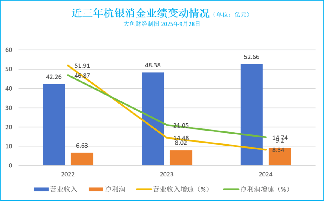 2022至2024年,杭银消费金融营收、净利润增速均明显放缓,其中,营收增速降至个位数。