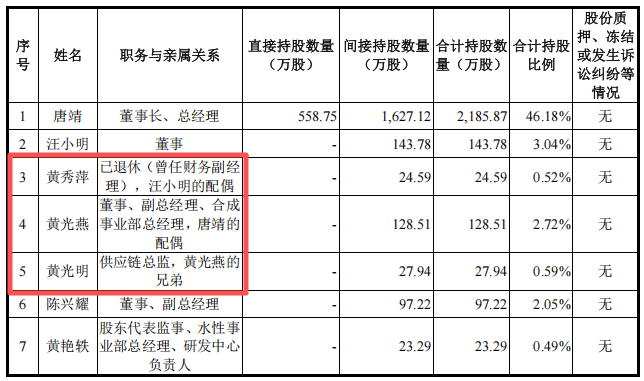 唐靖的妻子黄光燕作为一致行动人,担任公司董事、副总经理,且通过多种渠道间接持有公司股份。不仅如此,唐靖、黄光燕的多名亲属也在公司持股并担任要职。