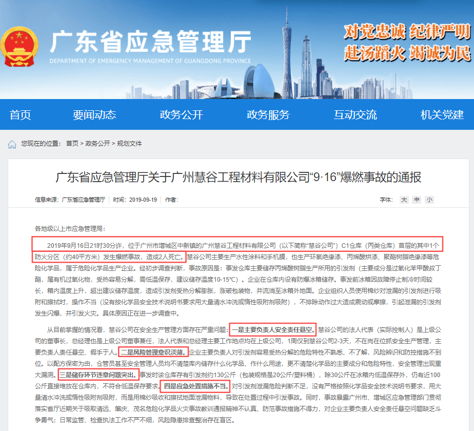 2019年9月16日,慧谷新材子公司——广州慧谷工程材料有限公司的C1仓库发生爆燃事故,造成2名员工当场死亡。