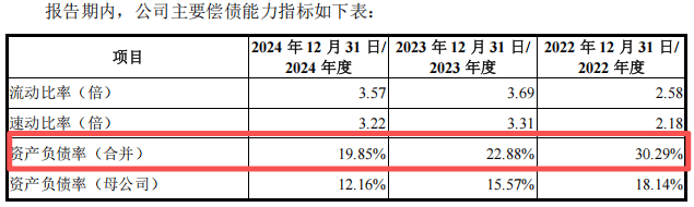 慧谷新材的资产负债率并不高,报告期内分别为30.29%、22.88%、19.85%,低于各期同行业可比公司均值。