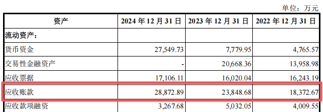 更令人担忧的是不断膨胀的应收账款。报告期内,公司应收账款账面价值如滚雪球般增长:从2022年的1.84亿元增加到2024年的2.89亿元,占资产总额比重连年攀升。