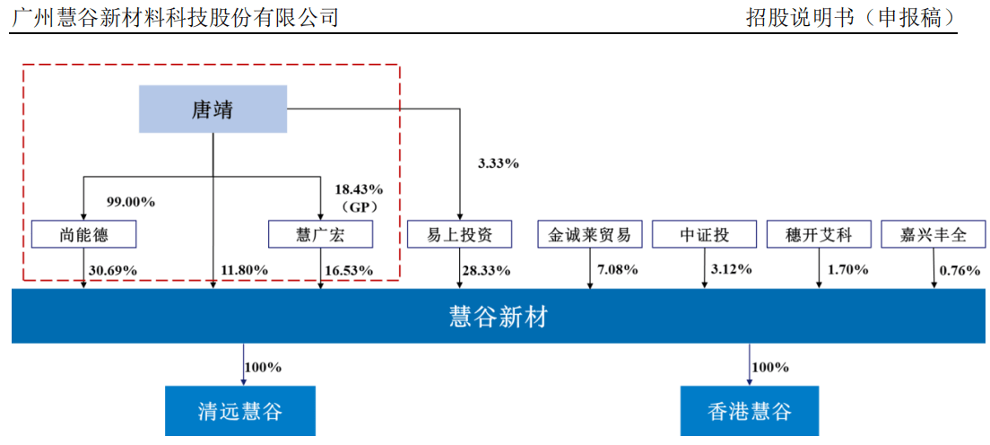 慧谷新材成立于1999年,主营业务为功能性树脂和功能性涂层材料的研发、生产和销售。唐靖作为慧谷新材的实际控制人,直接持有公司11.8%的股份,并通过尚能德、慧广宏分别控制公司30.69%、16.53%的表决权,合计控制公司59.02%的表决权。