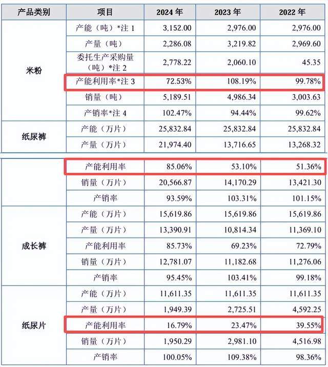 但结合招股书数据可知,2024年英氏控股米粉、纸尿裤产品的产能利用率分别为72.53%、85.73%,纸尿片的产能利用率更是低至16.79%。在产能利用率均未达到满产的状态下仍坚持募资扩产和提质改造,英氏此举难免令人心存疑惑。