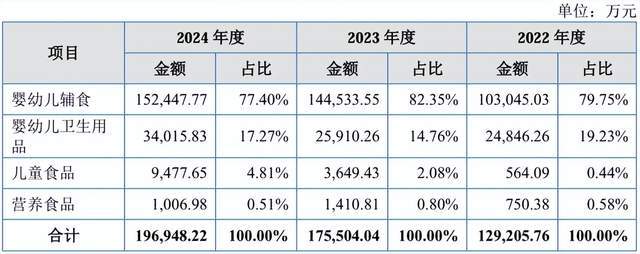 其中,婴幼儿辅食业务作为英氏控股的核心板块,2022年、2023年和2024年(同“报告期”)分别实现收入1.03亿元、1.45亿元和1.52亿元,在该公司主营业务中的占比超7成,且市场份额连续三年位列行业首位。