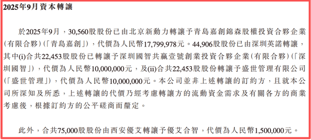 另在2025年9月,北京新动力向青岛嘉创转让所持优艾智合的部分股权,作价约1780万元;深圳英诺向深圳国智、盛世管理转让所持股权,分别作价1000万元、1000万元。转让完成后,北京新动力、深圳英诺分别持股5.18%、2.10%。