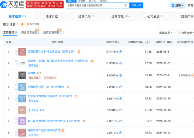 成立至今,优艾智合获得了多轮融资。天眼查App信息显示,优艾智合历经了10轮融资。目前,该公司的注册资本为人民币408.61万元,法定代表人为张朝辉,主要股东包括西安优艾、海纳华(海纳亚洲创投基金)等。