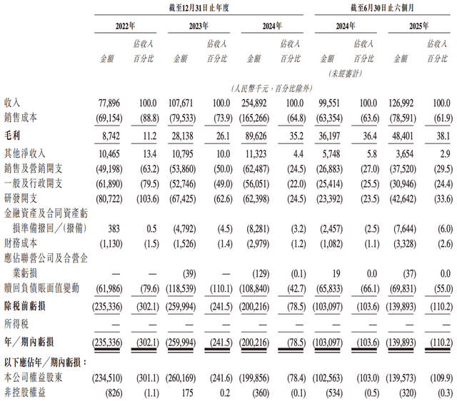 业绩方面,2022年、2023年、2024年度和2025年上半年,优艾智合的营收分别约为人民币7789.6万元、1.08亿元、2.55亿元和1.27亿元,净亏损分别约为2.35亿元、2.60亿元、2.00亿元和1.40亿元。