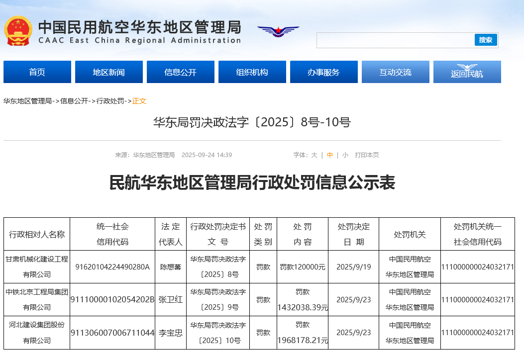 据中国民用航空华东地区管理局2025年9月23日发布的行政处罚决定(华东局罚决政法字〔2025〕10号),河北建设集团股份有限公司被处以罚款1968178.21元。