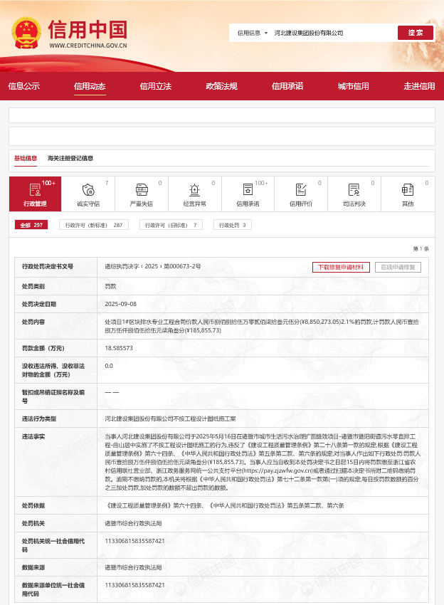 另据信用中国官网信息,2025年9月8日,诸暨市综合行政执法局对该公司作出行政处罚(诸综执罚决字﹝2025﹞第000673-2号)。处罚事由为:该公司在“诸暨市城市生活污水治理扩面提效项目—诸暨市暨阳街道污水零直排工程—曲山居”施工过程中,存在未按工程设计图纸施工的行为,违反了《建设工程质量管理条例》第二十八条第一款的规定,诸暨市综合行政执法局根据《建设工程质量管理条例》第六十四条、《中华人民共和国行政处罚法》第五条第二款、第六条的规定,对河北建设集团股份有限公司作出罚款185855.73元的行政处罚。
