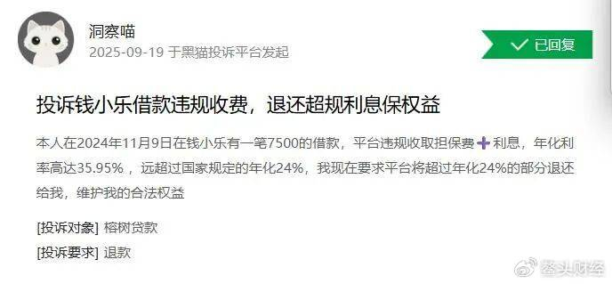 9月19日,一借款人在黑猫投诉平台上投诉称,2024年11月9日在钱小乐借款7500元,平台违规收取担保费+利息,年化利率高达35.95% 。