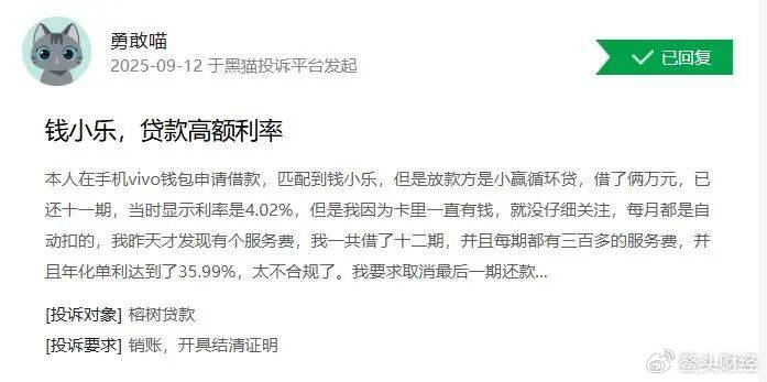 9月12日,一借款人投诉称,在手机vivo钱包申请借款,匹配到钱小乐,放款方是小赢循环贷,借了2万元,当时显示利率是4.02%,最近发现有服务费,年化单利达到35.99%。