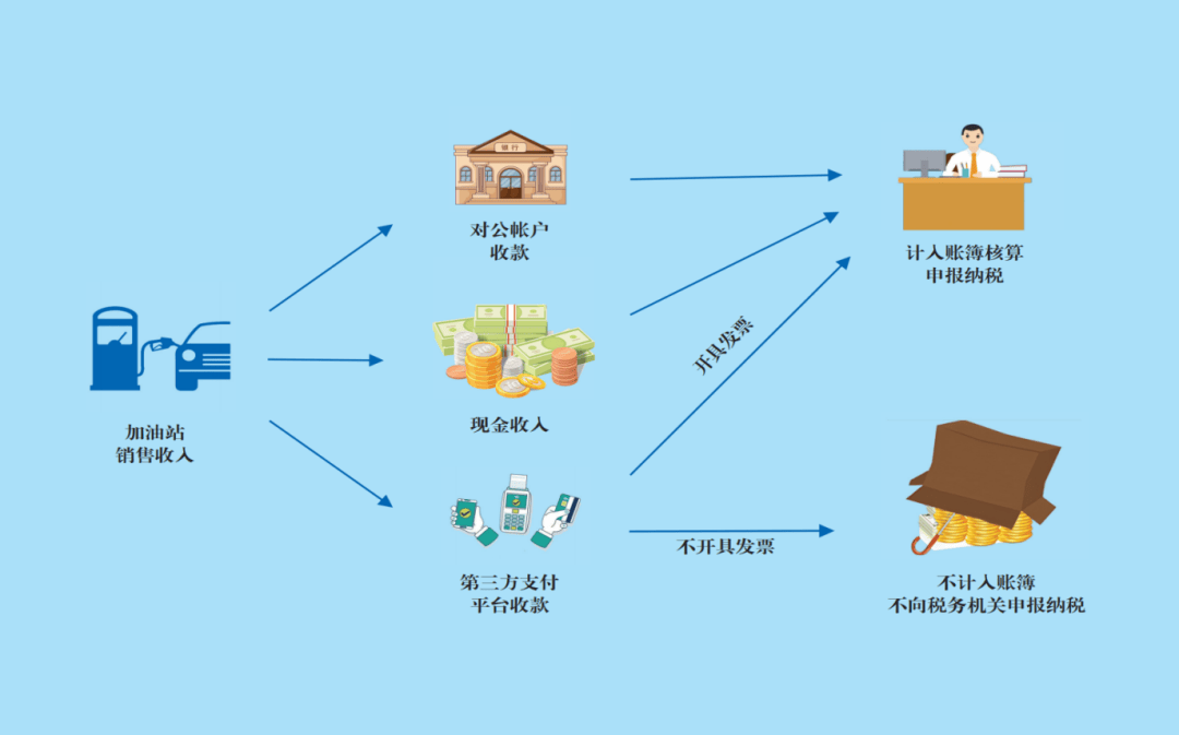 在进一步核查中,检查人员发现,该加油站通过移动支付方式收取的加油款既没有在账簿中记载,也没有在其对公账户的流水中发现相关记录,更没有找到其向税务机关申报纳税的痕迹。