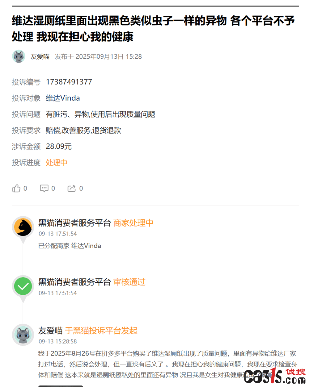 还有女性消费者表示,8月26日在拼多多平台购买的维达湿厕纸内发现异物,向厂家反映后迟迟未获处理。由于该产品直接接触私处,她担忧对健康造成影响,要求进行身体检查并获得相应赔偿。