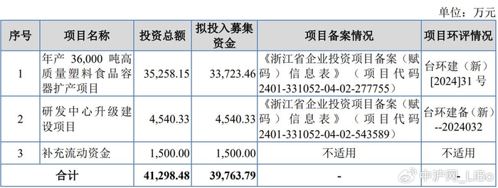 据招股书显示,新天力拟募集资金39,763.79万元,募集资金扣除本次发行费用后将用于公司年产36,000吨高质量塑料食品容器扩产项目、研发中心升级建设项目、补充流动资金,具体如下: