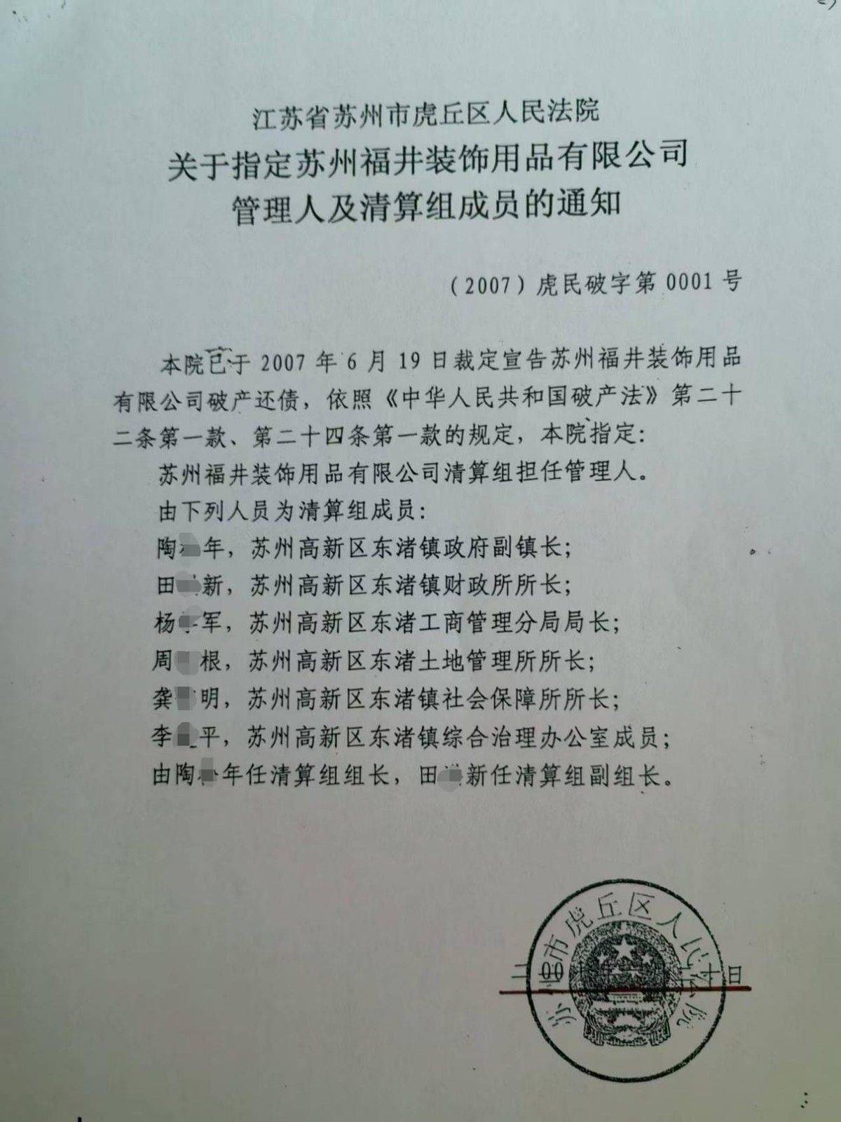 2008年1月,虎丘法院登报拟拍卖福井公司全部资产,债权人发现后阻止,并自行筹集67万余元支付职工工资及补偿金,以维持企业运营、阻止资产被低价处置。