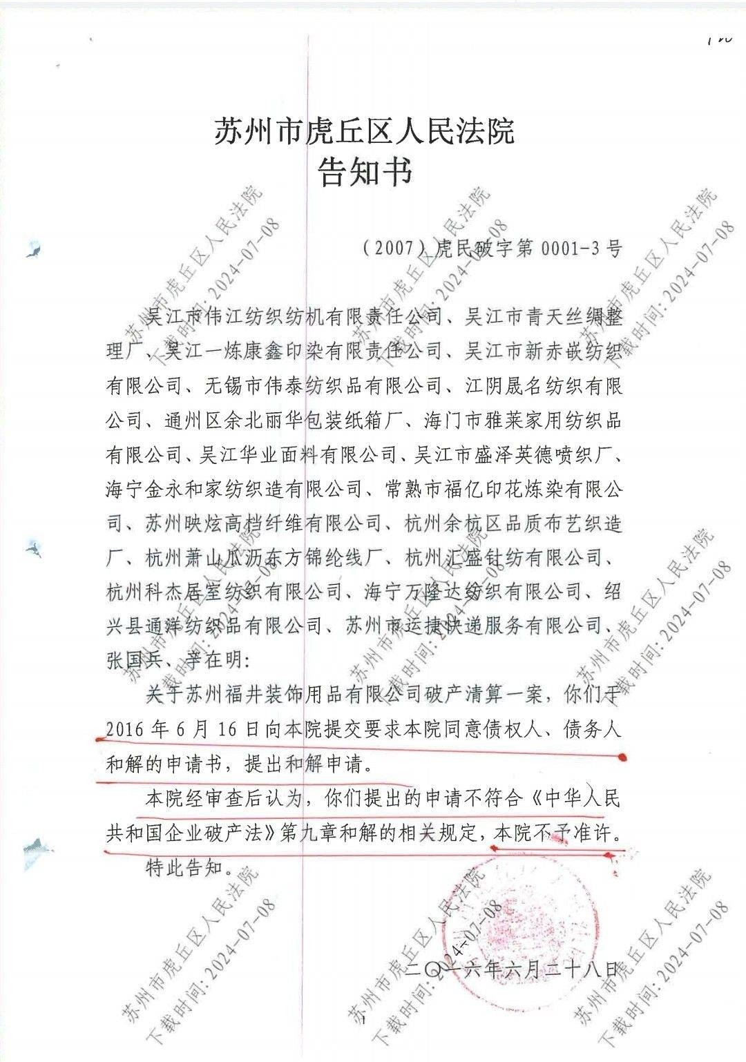 2016年6月28日,虎丘法院出具给债权人的《告知书》显示,拒绝债权人和债务人和解的理由是“本院经审查后认为,你们提出的申请不符合《中华人民共和国企业破产法》(以下简称《破产法》)第九章‘和解’的相关规定,本院不予准许。”结合债权人提交的《申请书》,多位律师皆认为该《申请书》内容中没有《破产法》第九章“和解”规定“拒绝”的情形。