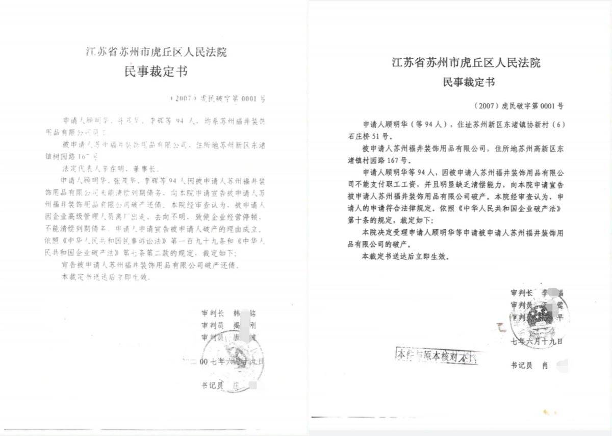 近年来,一起历时17年的企业破产案曾引发公众争议。发端于2007年的苏州福井装饰用品有限公司(以下简称:福井公司)的破产案中,相关方被指程序违法,事实认定不清,甚至涉故意毁灭证据等问题。福井公司债权人代表高峰、高慧民等人多年来持续向相关机关反映、申诉,始终未获正面回应。