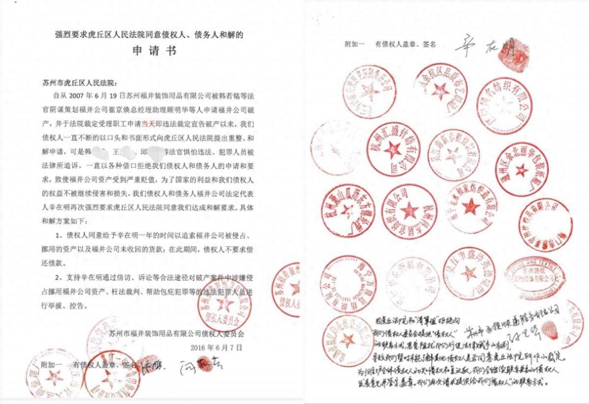 据了解,2016年6月7日,债权人和福井公司辛在明向虎丘区法院申请和解被驳回;2016年6月15日,福井公司资产被拍卖;2016年7月3日,债权人针对虎丘法院驳回和解申请,向虎丘法院等相关部门请求调查被拒;2016年10月,债权人委员会向上级法院申请再审,被驳回;2017年4月20日,虎丘法院裁定终结福井公司破产程序。自此,债权人追索债权权益丧失。