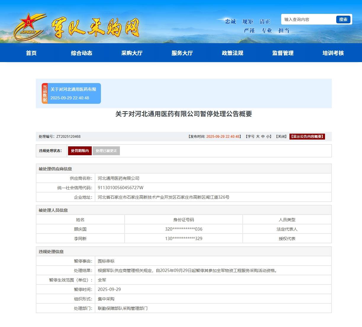 公告指出,河北通用医药有限公司在参与编号为2022-JQ05-W3476的采购项目过程中,存在涉嫌违规失信行为(围标串标)。依据军队供应商管理相关规定,决定自2025年09月29日起,暂停该公司参加全军物资工程服务采购活动的资格。