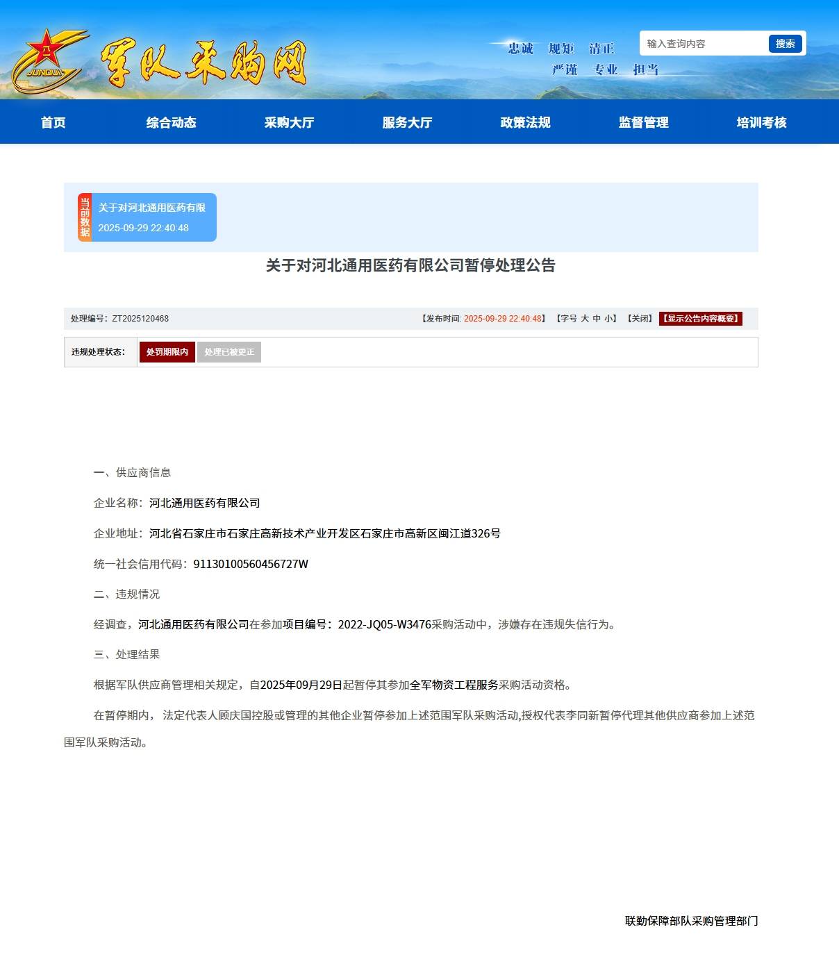 据军队采购网信息,探针财经获悉,联勤保障部队采购管理部门于2025年09月29日发布《关于对河北通用医药有限公司暂停处理公告》(公告编号:ZT2025120468)。