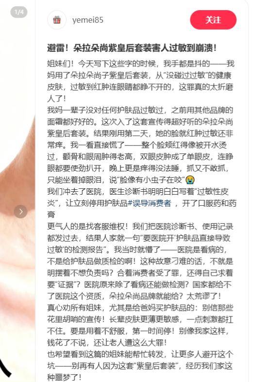 “我妈用了两天,脸肿得连眼睛都睁不开,晚上痒得坐着掉眼泪!”近日,消费者王女士向记者反映,其母亲使用朵拉朵尚紫皇后套装后,原本“从未过敏”的皮肤突发严重过敏,经医院检查后确诊为过敏性皮炎,而品牌方朵拉朵尚的回应却让她倍感无奈。