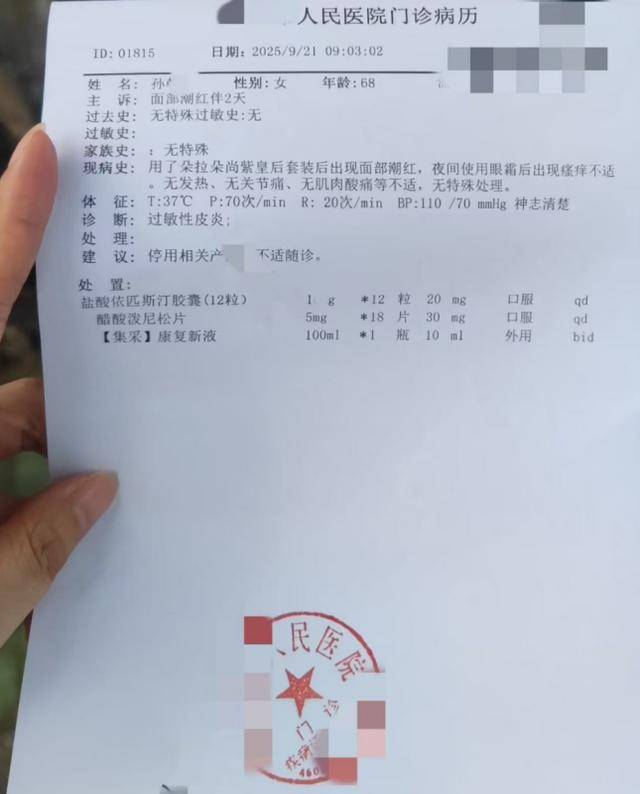 随后,王女士带母亲紧急就医,医院出具的诊断书明确显示为“过敏性皮炎”,并建议立即停用该套护肤品,同时开具了口服药与药膏缓解症状。“钱花了不说,最心疼的是老人遭罪,一辈子没经历过这种皮肤问题。”王女士难掩气愤。