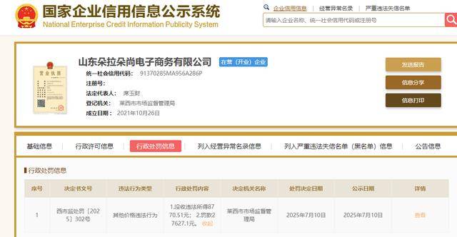 公开信息显示,山东朵拉朵尚电子商务有限公司是山东朵拉朵尚生物科技有限公司全资子公司,其法定代表人均为席玉财。
