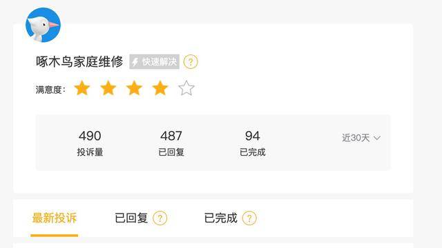 黑猫投诉平台上,啄木鸟家庭维修目前的累计被投诉量为8377条,已完成投诉数量为6473条。近30天在黑猫投诉平台上被共计投诉490条,其中仅有94条投诉已完成处理,尚有近400条未处理。