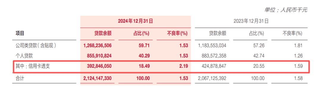 信用卡透支贷款余额也在持续下滑,2022年为4396.89亿元,2024年为3928.5亿元,占个人贷款比重更是从21.45%降至18.44%。