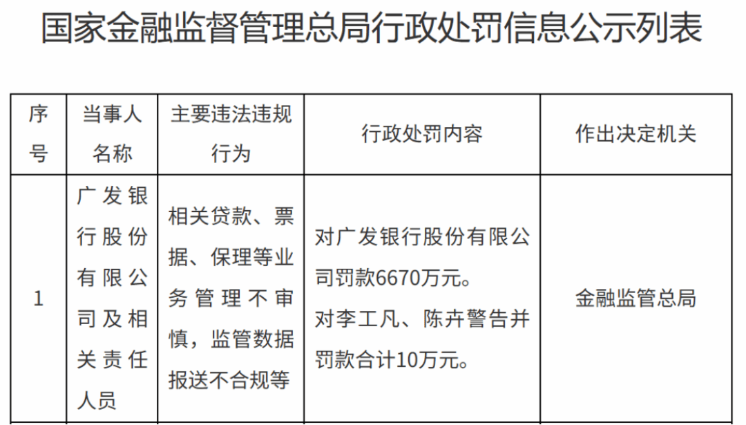 其中,广发银行因涉及贷款、票据、保理等业务管理不审慎,监管数据报送不合规等被罚6670万元。