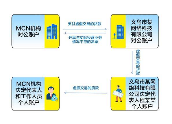原来,该MCN机构法定代表人张旭阳和义乌市某网络科技有限公司法定代表人程某某早有勾结,而双方公司交易平台虚拟币的业务既有真实的,也有虚假的。真实业务是该MCN机构向义乌市某网络科技有限公司购买平台虚拟币,通过银行账户支付款项,义乌市某网络科技有限公司开具销售发票。在虚假交易中,该MCN机构要求对方为自己开具与实际经营业务情况不符的发票并支付货款。货款到达义乌市某网络科技有限公司对公账户后,程某某再转至自己个人账户,然后通过银行转账打到张旭阳和该MCN机构工作人员的个人账户中,最终形成了资金“回流”闭环。