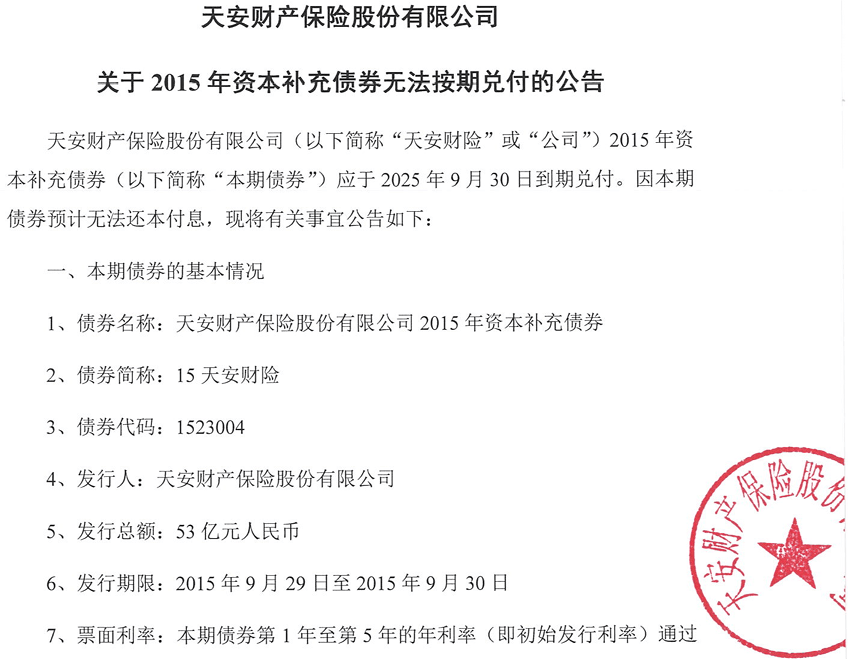 天安财产保险股份有限公司(以下简称天安财险)近日发布《关于2015年资本补充债券无法按期兑付的公告》,公司一笔53亿元资本补充债在2025年9月30日到期,因偿付能力不足,预计无法还本付息。这是保险业首例债券违约。