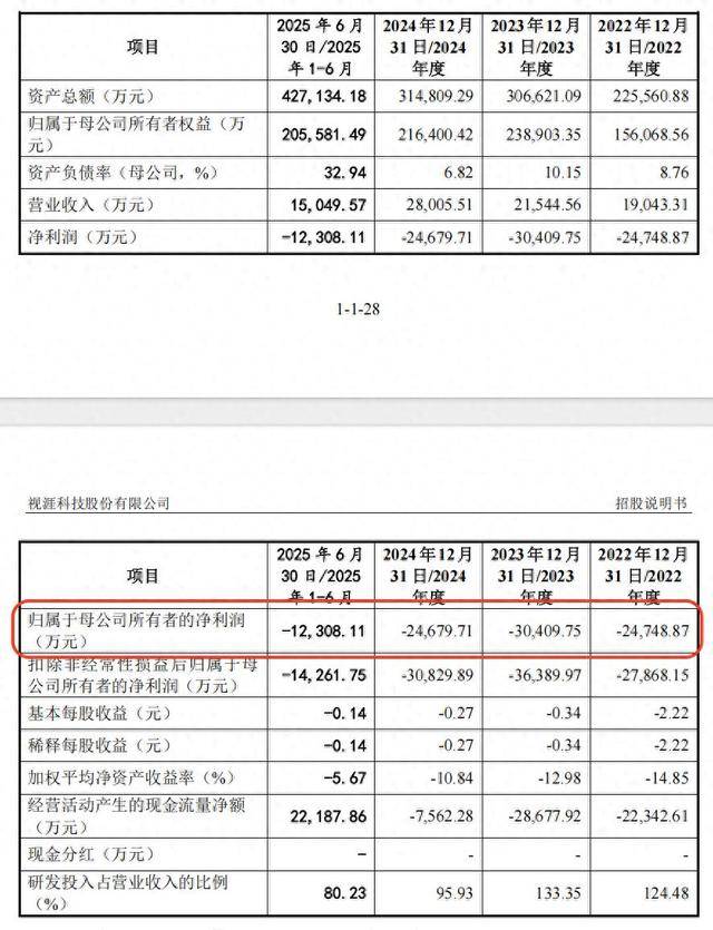 报告期(2022年~2025年上半年)各期,视涯科技分别实现营收约1.9亿元、2.15亿元、2.8亿元、1.5亿元,归母净利润-2.47亿元、-3.04亿元、-2.47亿元、-1.23亿元,3年半累计亏损约9.21亿元。